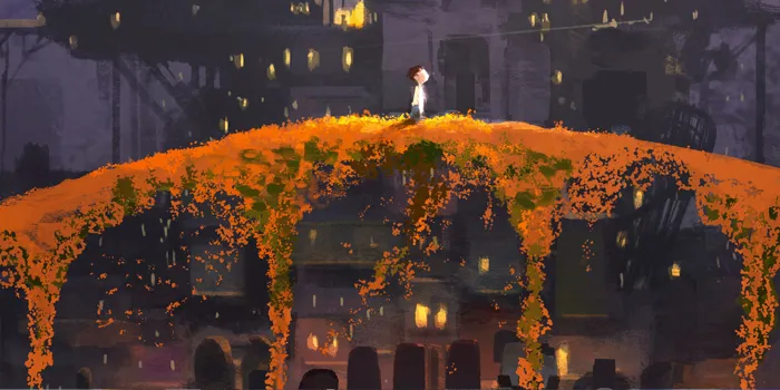 The Marigold Bridge is made of glowing petals. In Mexican tradition, these flowers guide the spirits of the deceased back to their families.